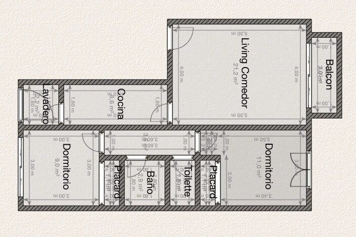 Las medidas de los ambientes son: Living 6 x 3.50, 2 dormitorios de 3 x 3 mas placard y balcón corrido de 3.50 x 1.20.